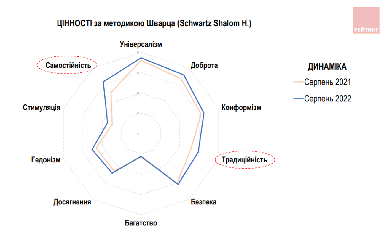 Також лекторка навела результати «Сімнадцятого загальнонаціонального опитування: Ідентичність. Патріотизм» (17 – 18 серпня 2022) групи «Рейтинг» серед українців, де спостерігається динаміка у бік цінностей самовизначення та відкритості до змін, традиційно домінують універсалізм та доброта. А певні цінності, наприклад, самостійність, універсалізм, доброта, безпека та досягнення притаманні представникам усіх вікових категорій.
