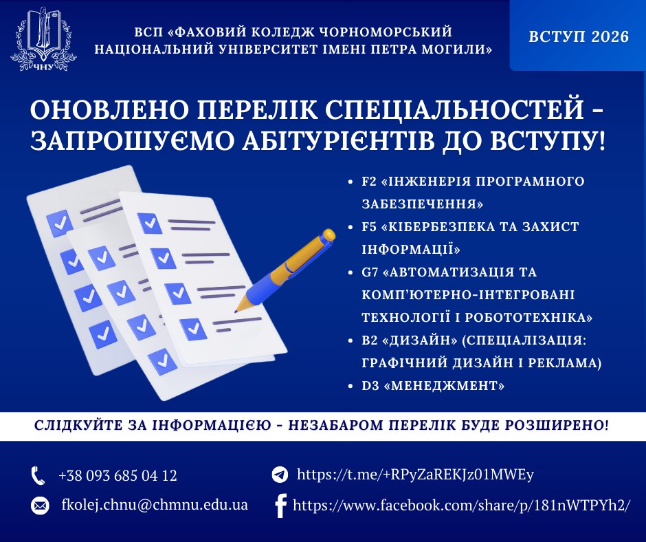 Фаховий коледж Чорноморського національного університету імені Петра Могили отримав ліцензію на підготовку здобувачів освіти за спеціальністю F5 «Кібербезпека та захист інформації» на рівні фахового молодшого бакалавра.