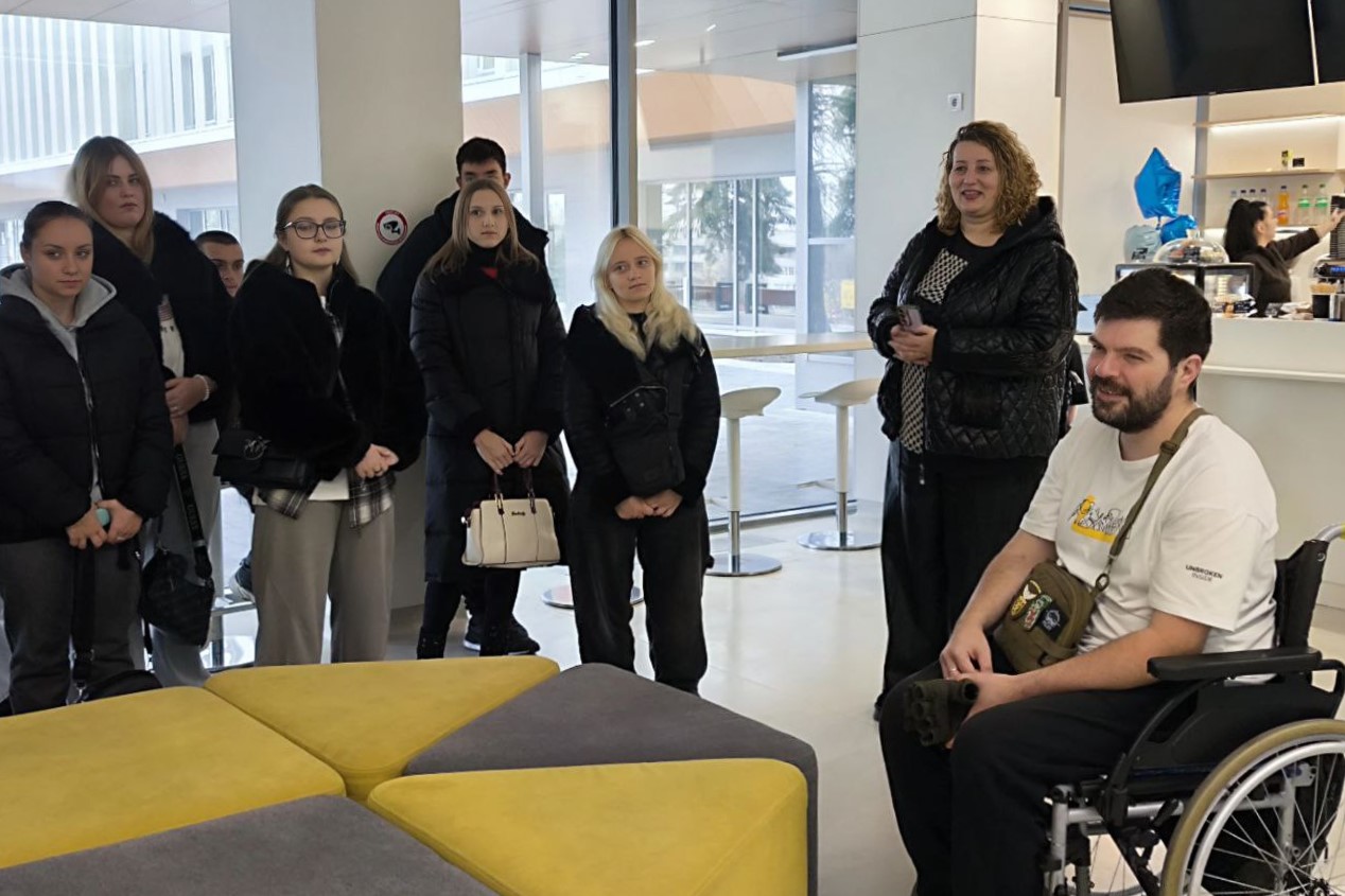 У Центрі студентів зустрів волонтер, ветеран, боєць 103‑ї Львівської бригади ТрО Михайло Фатєєв, який наразі проходить там реабілітацію після кульового поранення хребта. Він розповів, як пішов на війну, отримав поранення та потрапив на реабілітацію до Центру UNBROKEN у 2024 році, про неймовірну атмосферу цього закладу охорони здоров’я, високий професіоналізм спеціалістів та індивідуальний підхід до кожного пацієнта. Також Михайло розповів про просвітницькі та культурні заходи в Центрі, до яких залучають ветеранів та військових, відзначивши, що такі події сприяють їхній соціальній адаптації й поверненню до активного життя.