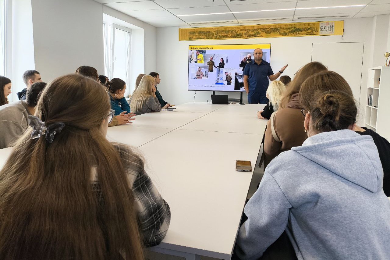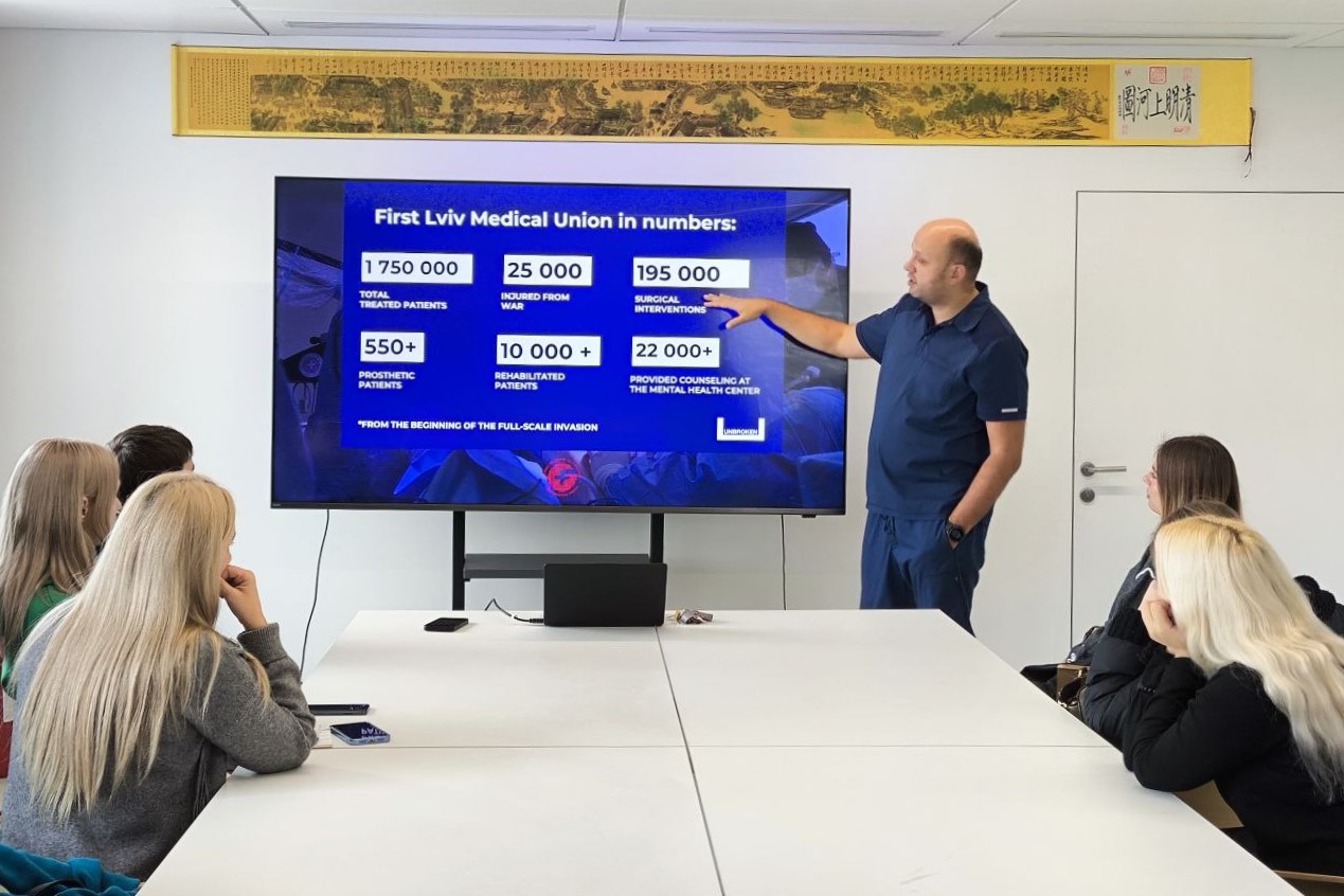 До того ж зі студентами поспілкувався керівник Центру UNBROKEN Олег Білянський. Він розповів, що реабілітаційний центр працює на базі Першого медоб’єднання Львова та входить до екосистеми UNBROKEN. Центр забезпечує повноцінне лікування, реабілітацію та реінтеграцію людей, що постраждали внаслідок війни. Серед основних напрямків роботи Центру: реконструктивна хірургія, ортопедія, протезування. Тут не лише встановлюють протези, а й виготовляють їх. Всю медичну допомогу пацієнти отримують безоплатно. Крім того у Центрі займаються фізичною, психологічною та психосоціальною реабілітацією. Центр працює заради того, щоб українці, які пройшли через війну, змогли отримати професійну медичну допомогу у своїй країні й повернутися до повноцінного життя. Як відзначив керівник центру, за час повномасштабного вторгнення тут пройшли реабілітацію понад 20 000 поранених українців, серед яких 360 дітей.