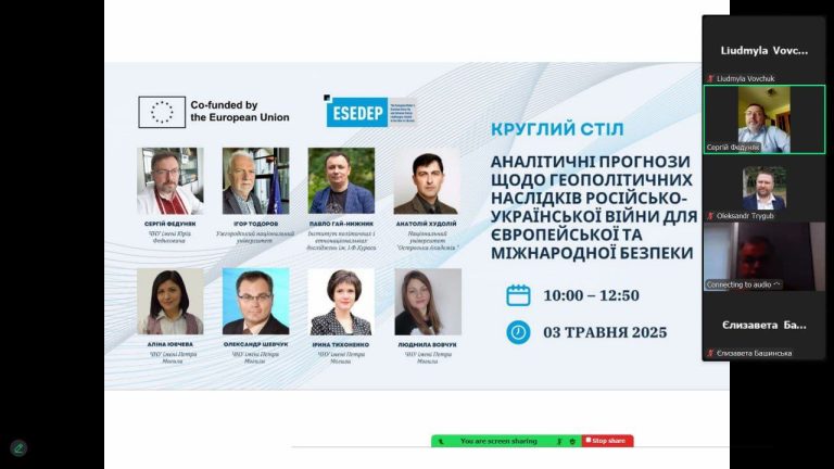 03 травня 2025 року в рамках навчального курсу «Спільна політика безпеки та оборони Європейського Союзу: виклики, пов’язані з війною в Україні» (ESEDEP) відбувся круглий стіл на тему «Аналітичні прогнози щодо геополітичних наслідків російсько-української війни для європейської та міжнародної безпеки». Захід … Читати далі Відбувся круглий стіл: Геополітичні наслідки російсько-української війни для європейської та міжнародної безпеки