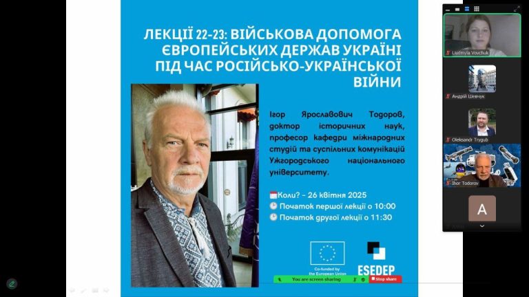 26 квітня 2025 року в онлайн-форматі відбулися дві відкриті лекції, присвячені темі військової допомоги європейських держав Україні в контексті триваючої російсько-української війни. Лектором виступив Ігор Ярославович Тодоров — доктор історичних наук, професор кафедри міжнародних студій та суспільних комунікацій Ужгородського національного … Читати далі Відкриті лекції експерта Ігора Тодорова: Військова допомога європейських держав Україні під час російсько-української війни