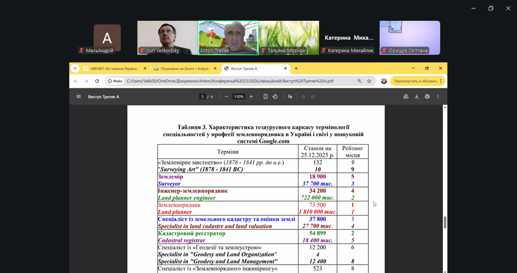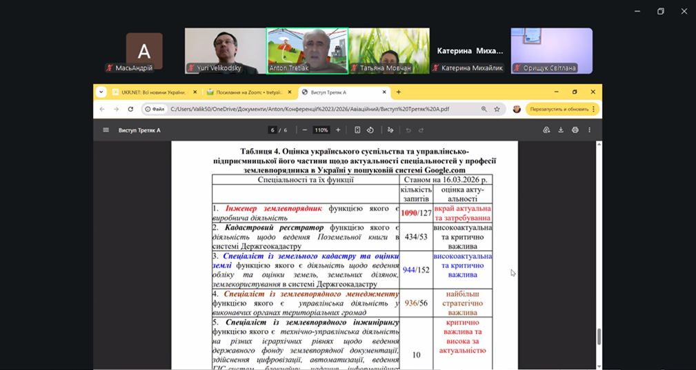 27 березня 2026 року в онлайн-форматі відбулася ХІ Міжнародна науково-практична конференція «Сучасні технології землеустрою, кадастру та управління земельними ресурсами». Захід був організований Державним університетом «Київський авіаційний інститут» та приурочений до Дня землевпорядника України. Конференція зібрала провідних фахівців, науковців та освітян для обговорення актуальних питань галузі. Викладачі кафедри управління земельними ресурсами та здобувачі спеціальності G18 активно долучилися до заходу, зокрема до круглого столу на тему «Земельне законодавство та судова експертиза».