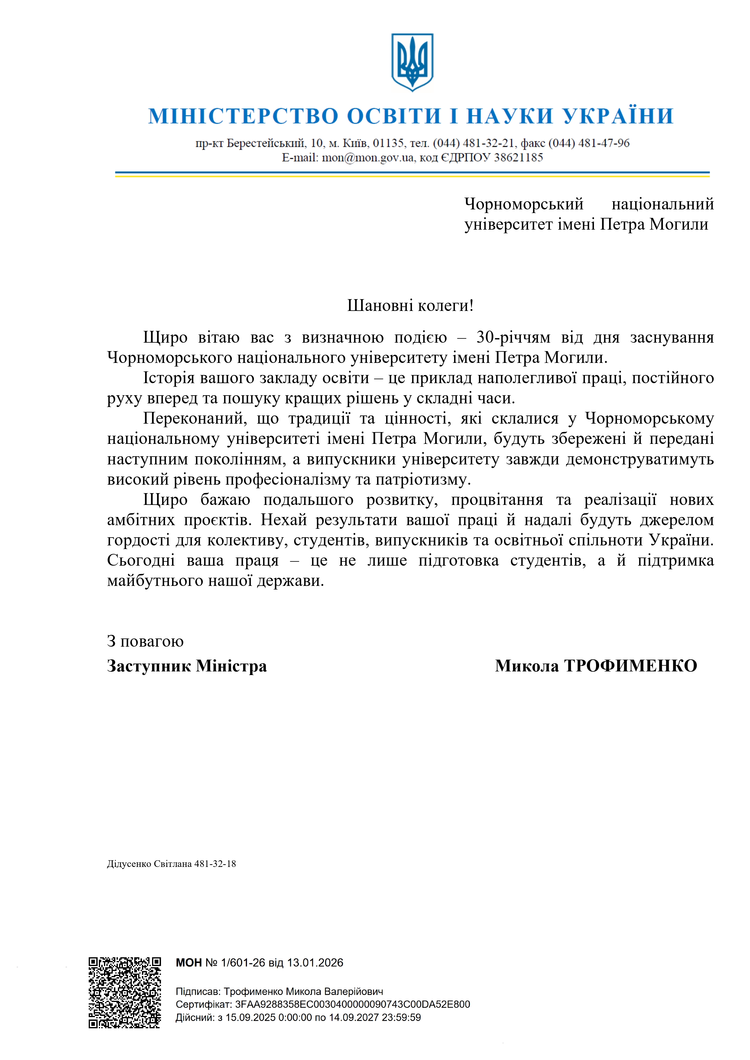 Чорноморський національний університет імені Петра Могили щиро дякує партнерам та колегам за привітання з нагоди важливої події – 30-річчя від дня заснування університету.