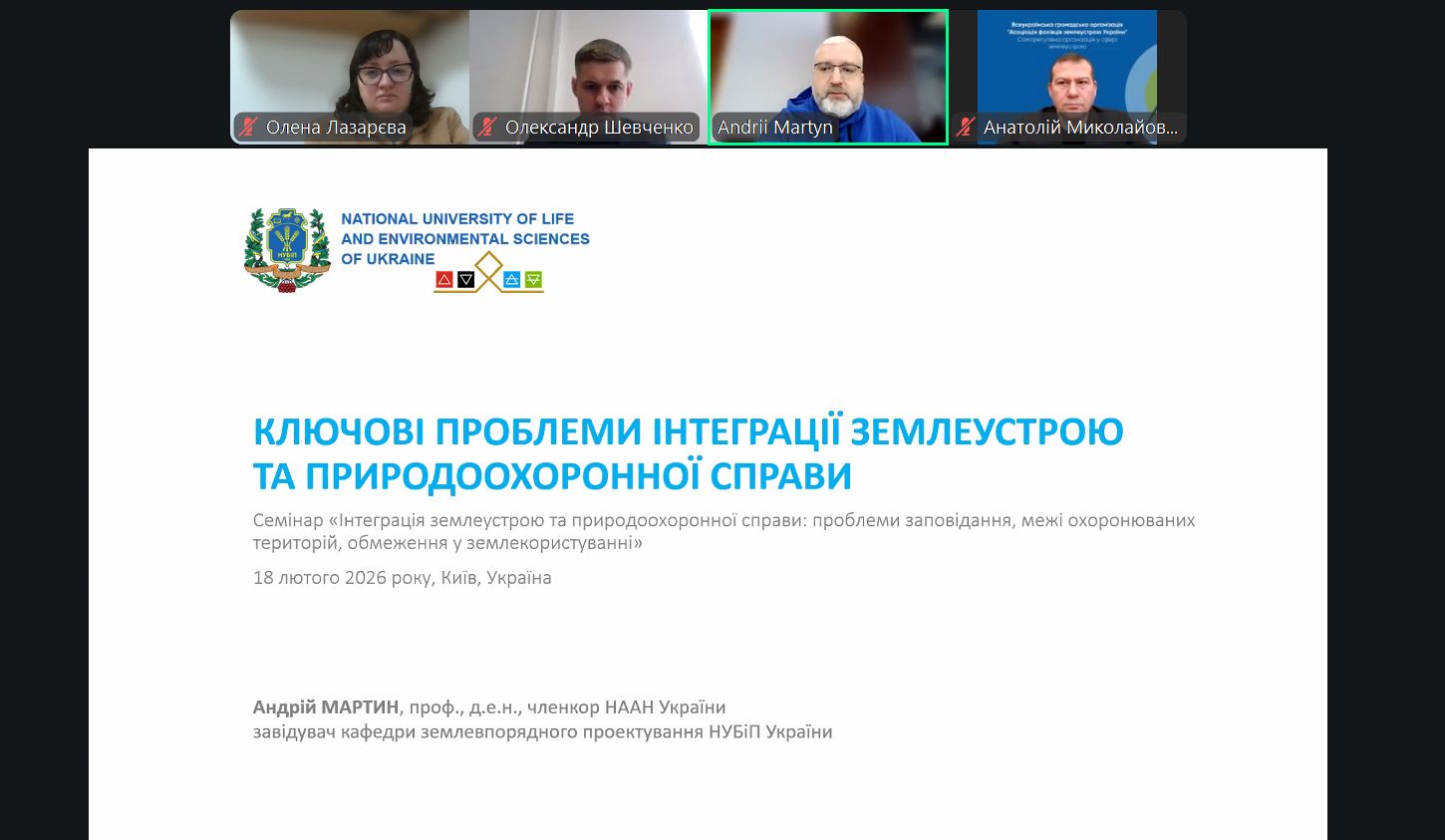 18 лютого 2026 року здобувачі вищої освіти спеціальності G18 та викладачі кафедри управління земельними ресурсами взяли участь у всеукраїнському науково-практичному семінарі «Інтеграція землеустрою та природоохоронної справи: проблеми заповідання, межі охоронюваних територій, обмеження у землекористуванні».