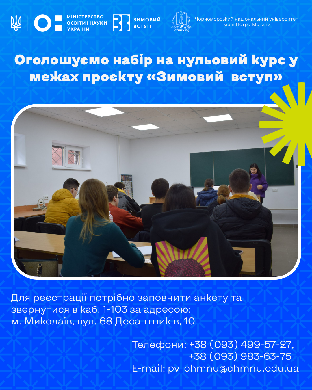 Чорноморський національний університет імені Петра Могили в числі провідних університетів України розпочинає реалізацію державного експериментального проєкту «Зимовий вступ». Це інтенсивна підготовча програма, розроблена для системної підготовки вступників до складання Національного мультипредметного тесту та адаптації до навчання в університетському середовищі.